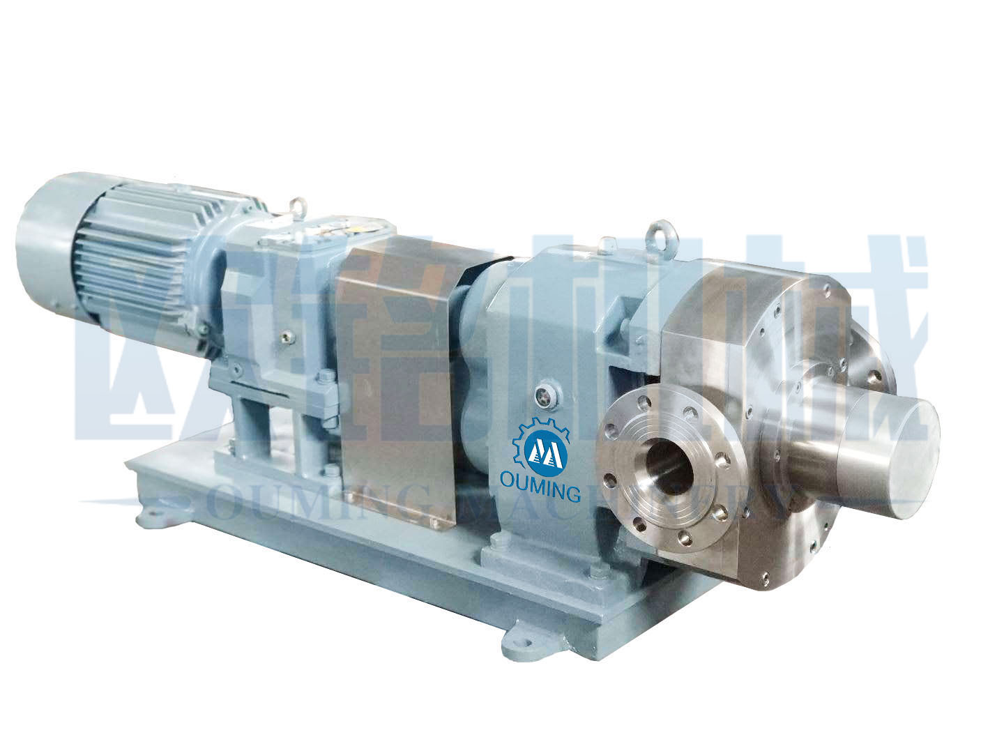 該產(chǎn)品借助于工作腔里的多個固定容積輸送單位的周期性轉(zhuǎn)化來達到輸送流體的目的。原動機的機械能通過泵直接轉(zhuǎn)化為輸送流體的壓力能,泵的流量只取決于工作腔容積變化值以及其在單位時間內(nèi)的變化頻率,而(理論上)與排出壓力無關(guān);轉(zhuǎn)子泵依靠兩個同步反向轉(zhuǎn)動的轉(zhuǎn)子(轉(zhuǎn)子葉數(shù)為2-8)在旋轉(zhuǎn)過程中于進料口處產(chǎn)生吸力(真空度),兩轉(zhuǎn)子將轉(zhuǎn)子室分隔成幾個小空間,在傳動軸的帶動下進行反方向旋轉(zhuǎn),介質(zhì)即被輸送至出料口,從而產(chǎn)生了較高的排放壓力,如此往復(fù)循環(huán),特別適合中高粘度介質(zhì)的輸送。